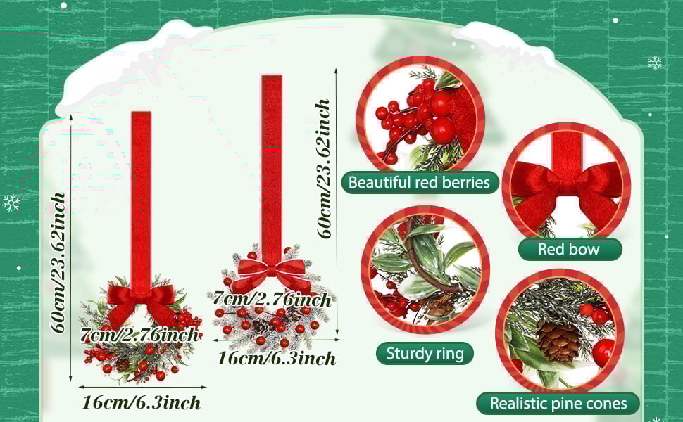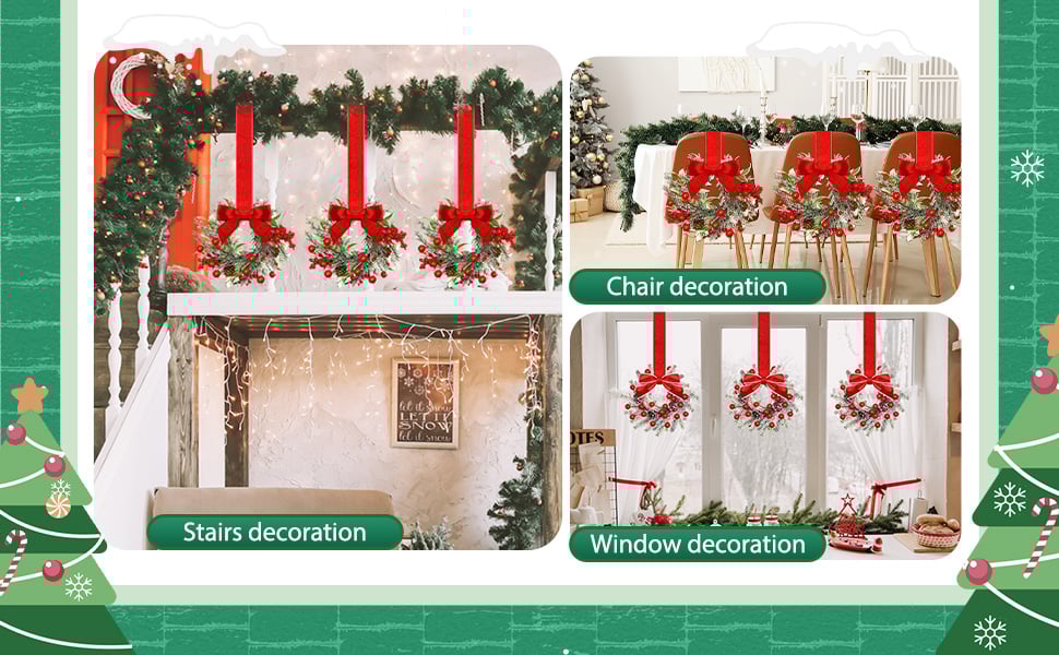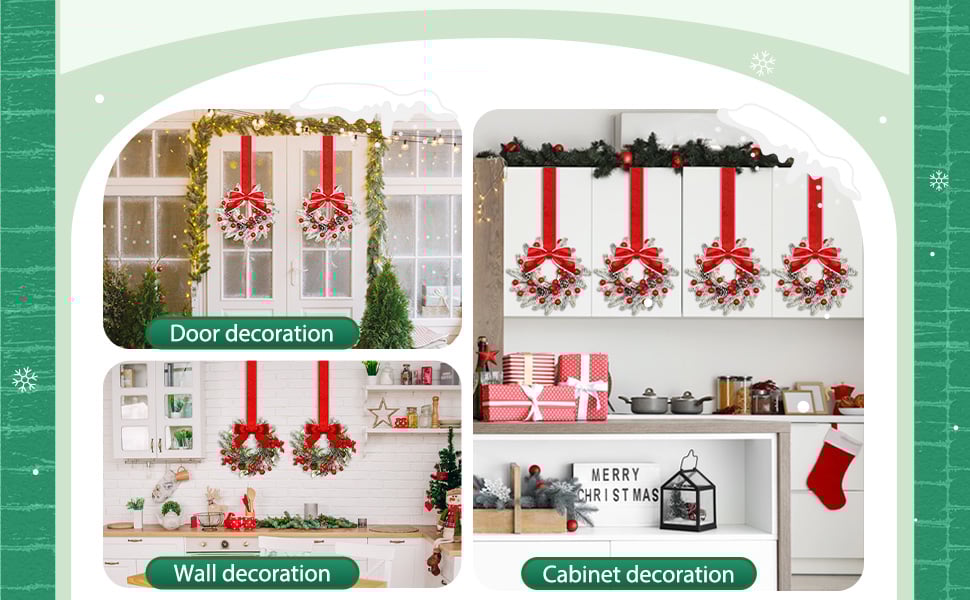 Detailed Decorative Features: the mini Christmas wreath for kitchen cabinets are decorated with berries, pine cones, red bows and so on; Their stylish, lifelike decorative features give them an authentic festive feel that is sure to impress