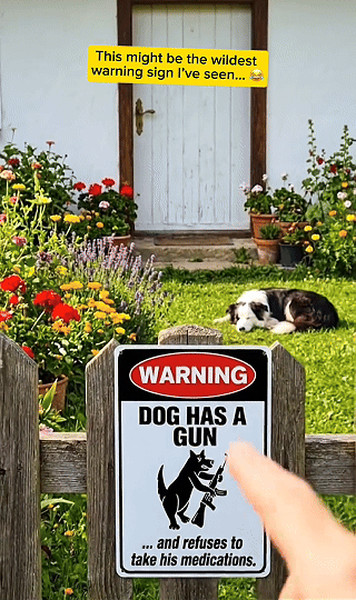 Bold, Funny Message: "Warning — Cat/Dog Has a Gun and Refuses to Take His Medications." Perfect for pet lovers with a sense of humor!