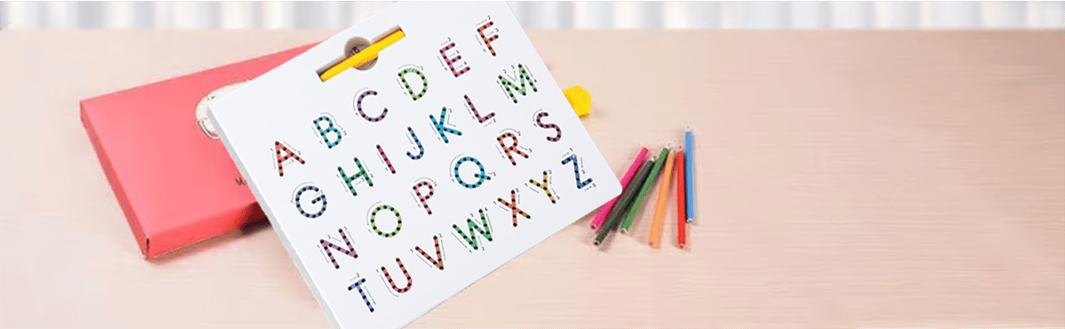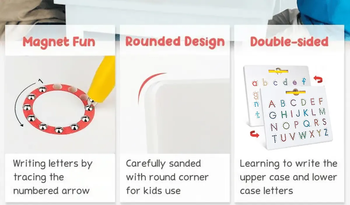 •2 Sided Letter Tracing Board: Upper case on one side and Lower case on the other side. Great Tool to Teach Writing: users using the stylus pen help them stay on the stroke - and they love to hear and see the metal beads pop up as they go. Then they can use their finger to erase each letter. With the sequence stroke and path direction instruction guide next to each alphabet character.
