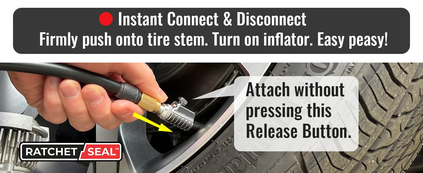 Upgrade your tire inflator with fast, frustration-free connectivity. The Platinum delivers a seamless push-to-connect experience using our patented RatchetSeal™ locking system, ensuring a secure, air-tight grip on any standard Schrader valve. Built for speed, durability, and professional performance—this is the tire chuck that transforms the way you inflate.