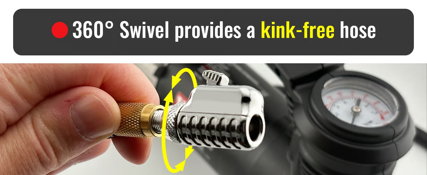 Built-in 360° swivel head prevents hose kinks, maximizing flexibility and airflow.
